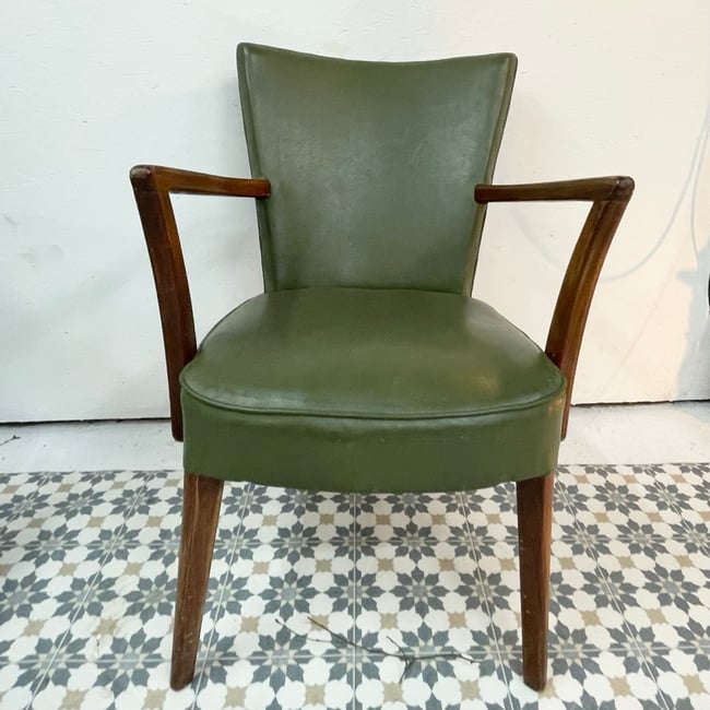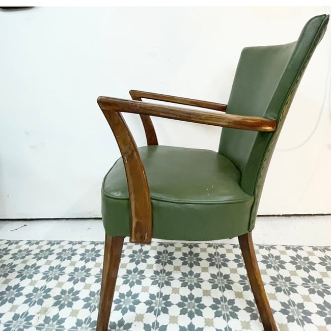 A beautiful pair of original 1930’s Art Deco armchairs with beach wood arms and legs, original horse hair stuffing with Olive Green rexine upholstery. These stunning chairs are stylish along with being extremely comfortable and are a nifty size perfect for a small space. For interior design lovers only. Each chair is 84cms height x 56cms width