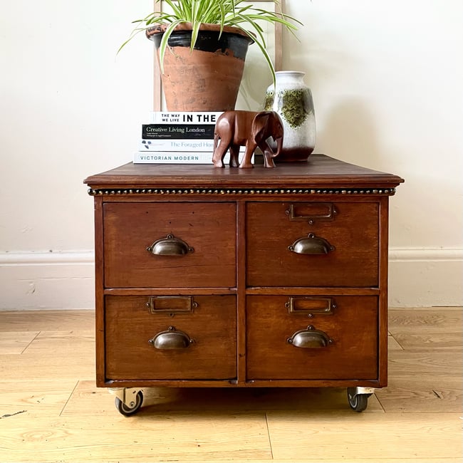 This gorgeous English antique wooden filing box has been repurposed as a low coffee table/plant table.