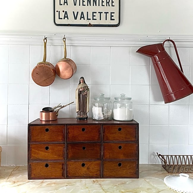 French antique wooden table top sorting drawers. This stunning piece is in excellent condition and is such a useful piece of equipment, it has 9deep drawers to collect and organise your bits and bobs. It's a special piece with a simple clean aesthetic and beautifully made. DM for more details71cms length x 35cms height x23cms depth